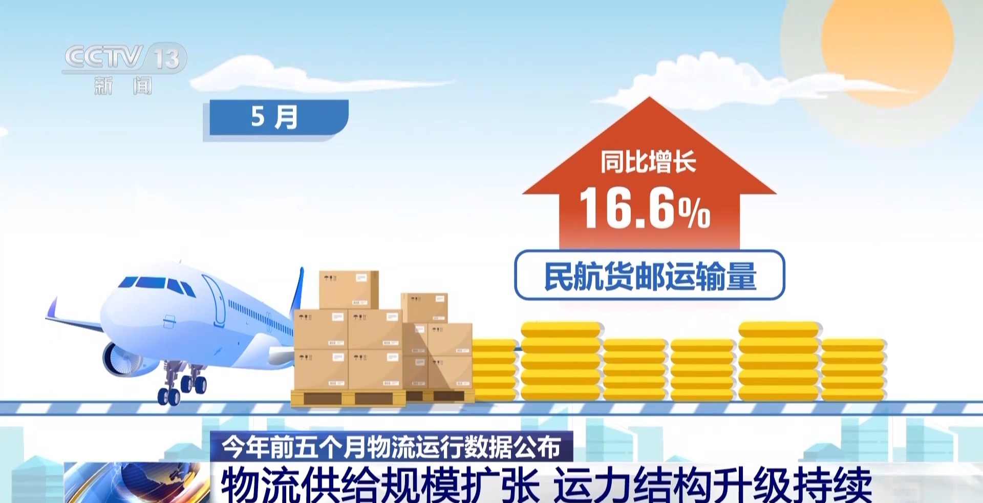 1—5月份,物流业总收入5.6万亿元,同比增长4.2%。今年以来,我国物流运输网络运行稳定,结构调整态势延续,同时航空跨境物流、铁路国际运输等保障能力增强,有效支撑物流循环。