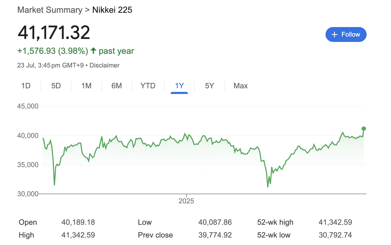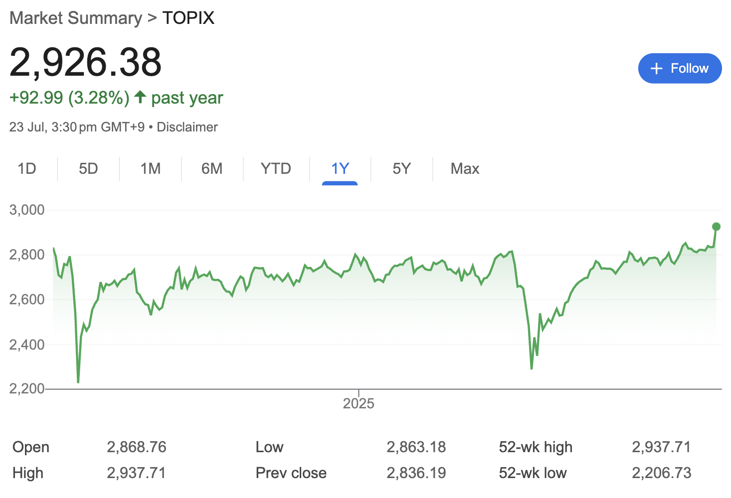 “对日本股市来说,下一个变数是石破茂的去留,他此前表示将在美日贸易谈判结束后解释如何对参议院选举惨败负责。”嘉盛集团资深策略师斯考特(David Scutt)对记者表示。