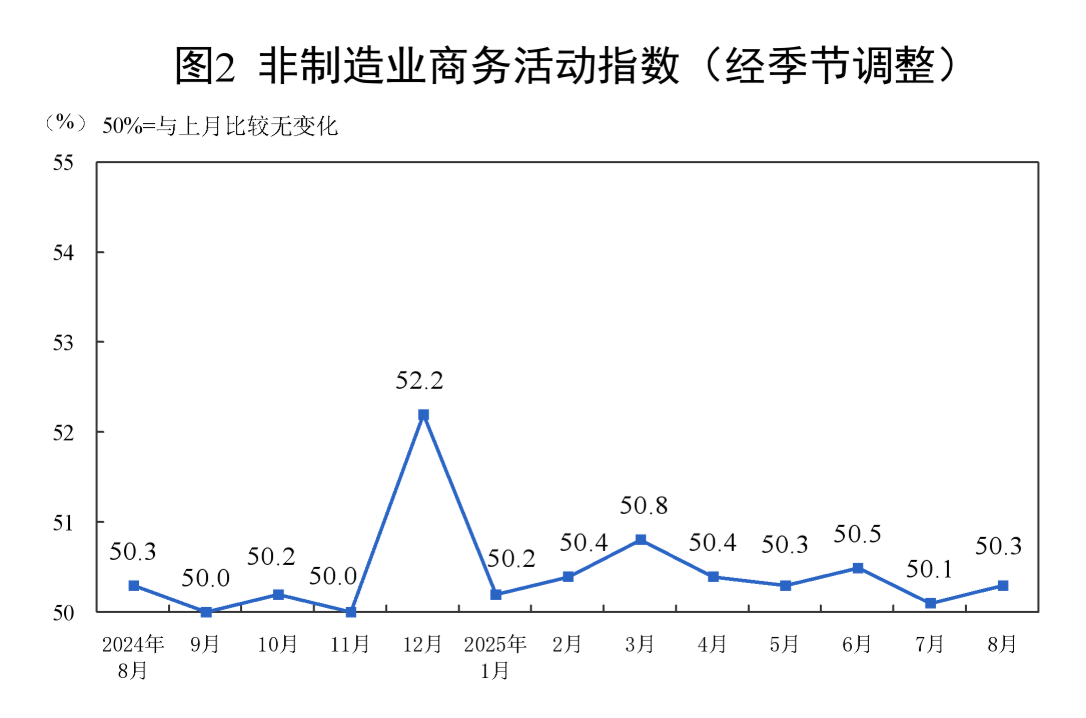8月份,非制造业商务活动指数为50.3%,比上月上升0.2个百分点,非制造业继续保持扩张。