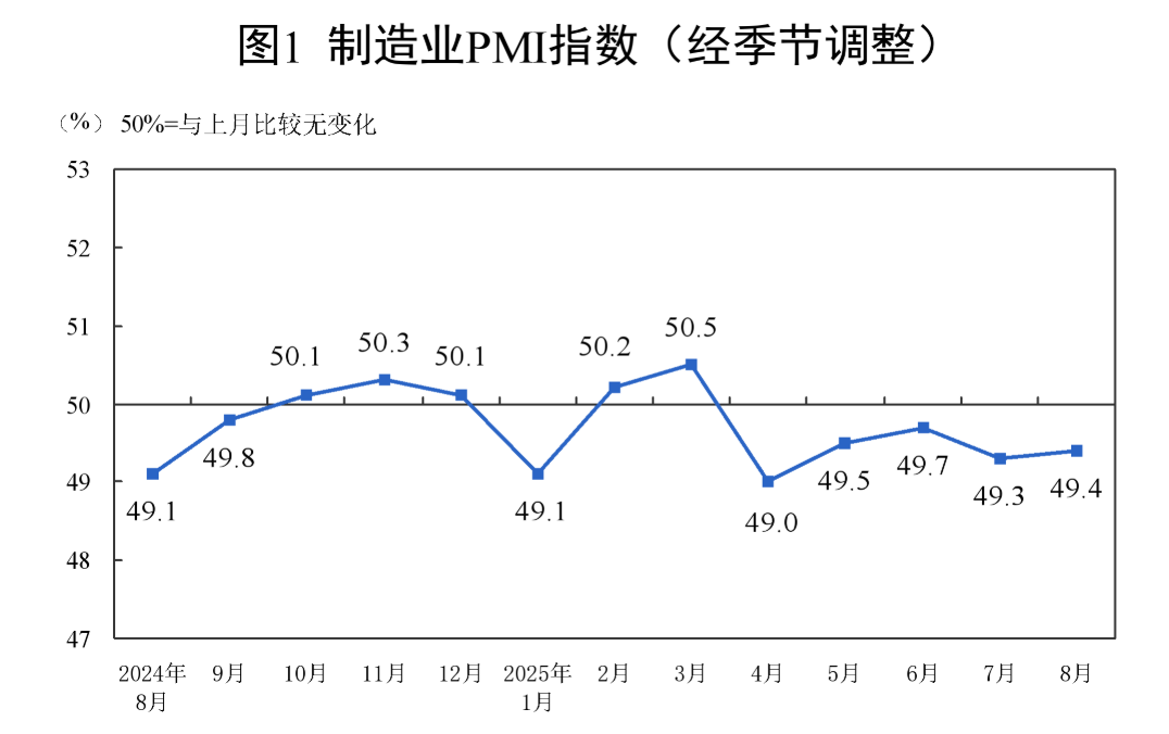 国家统计局8月31日发布的8月份制造业采购经理指数(PMI)为49.4%,比上月上升0.1个百分点,制造业景气水平有所改善。非制造业商务活动指数为50.3%,比上月上升0.2个百分点,非制造业继续保持扩张。