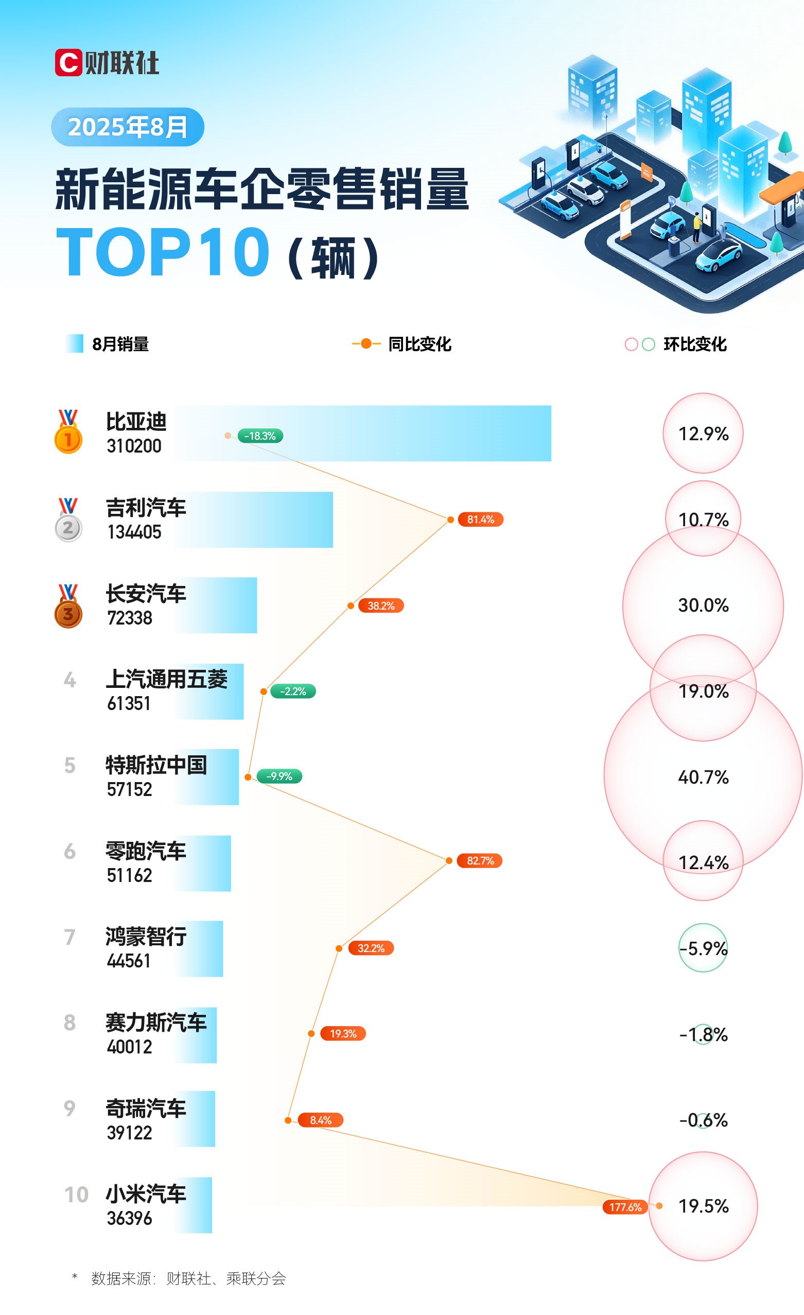 与此同时,备受关注的8月新能源车企零售销量TOP10榜单也同步揭晓,比亚迪继续稳居榜首,多家车企名次调整,小米汽车以超170%的同比增幅成为“增长王”。