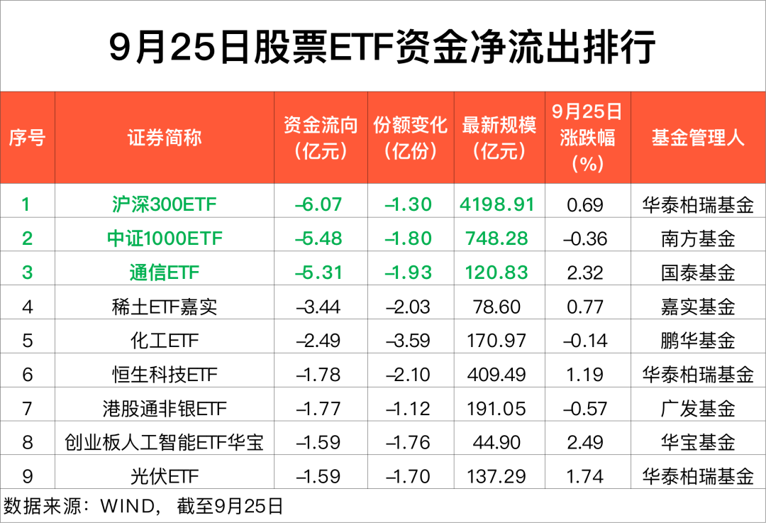 除上述提到的宽基ETF外,资金流出的各类细分行业主题ETF有通信ETF(6.7亿元)、稀土ETF(3.9亿元)、石化化工ETF(3亿元)。