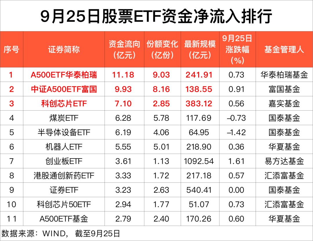 宽基ETF相关产品净流入同样明显。具体到指数维度,9月25日中证A500指数ETF资金净流入居前,达25亿元。规模变化方面,宽基ETF昨日规模上升167.87亿元。