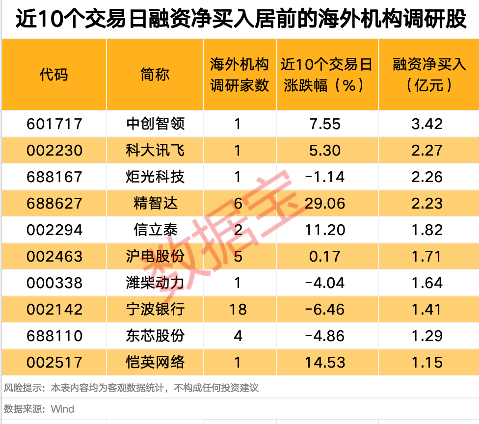 从资金面来看,近10个交易日超半数海外机构调研股获得融资客加仓,其中10股获得融资净买入均超亿元。中创智领、科大讯飞、炬光科技、精智达等股的净买入额居前,中创智领累计获得3.42亿元净买入,居首。