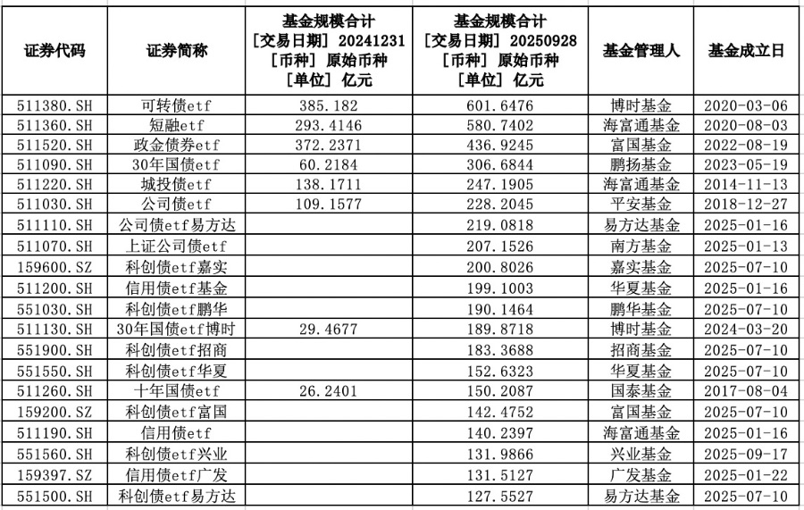 Wind数据显示,截至9月28日,32只债券型ETF规模突破百亿元大关,其中,博时可转债ETF规模突破600亿元,海富通短融ETF规模580亿元,规模位居前列。
