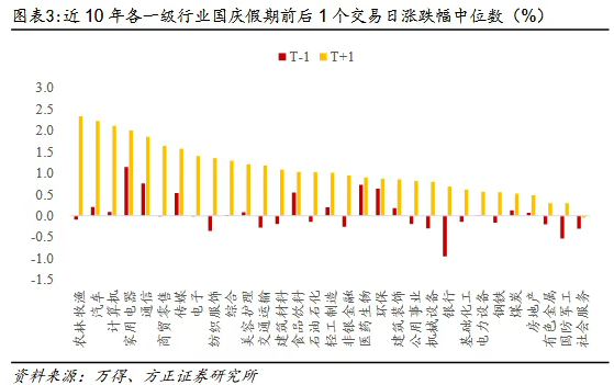 行业层面,方正证券表示,从行业指数看,申万一级行业在假期后短期同样多数收涨。其中,农林牧渔、汽车、计算机、家用电器和通信行业节后首个交易日涨跌幅中位数分别为+2.34%、+2.22%、+2.11%、+2.00%和+1.85%,表现靠前。