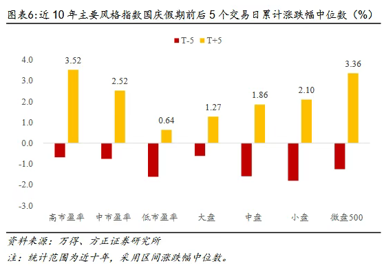 “同时,高市盈率、中市盈率、低市盈率指数节后5个交易日累计涨跌幅中位数分别为+3.52%、+2.52%、+0.64%。大盘、中盘、小盘指数节后5个交易日累计涨跌幅中位数分别为+1.27%、+1.86%、+2.10%。”方正证券指出。