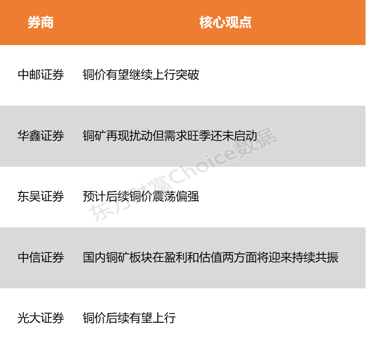 中邮证券表示,目前市场在定价美国滞胀或软着陆,铜依然会有不俗的表现,结合供需紧张的预期,铜价有望继续上行突破,或长期保持在10500美金以上。华鑫证券指出,目前铜需求旺季未启动,但是供应扰动再起,预计铜价将走强。