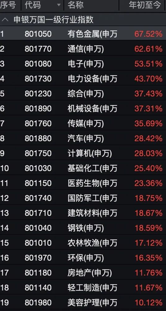 从申万一级行业来看,前三季度行业表现也出现巨大分化。有色金属、通信、电子位居前三,年内涨幅均超50%,电力设备、综合、机械设备、传媒、汽车、计算机、基础化工、医药生物等板块涨幅超过20%;煤炭、食品饮料、石油石化、交通运输等板块逆势下跌。