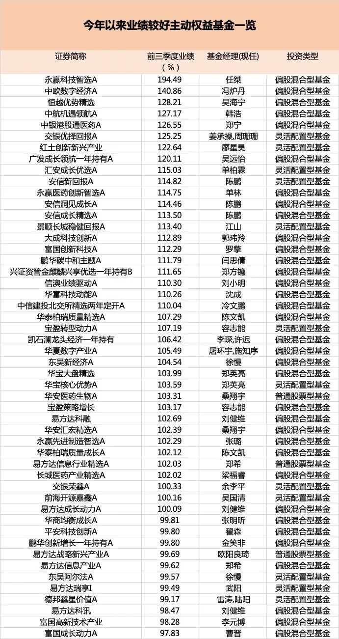 在这样的基础市场下,前三季度主动权益基金单位净值增长率平均达到29.24%,最牛基金涨幅接近195%。