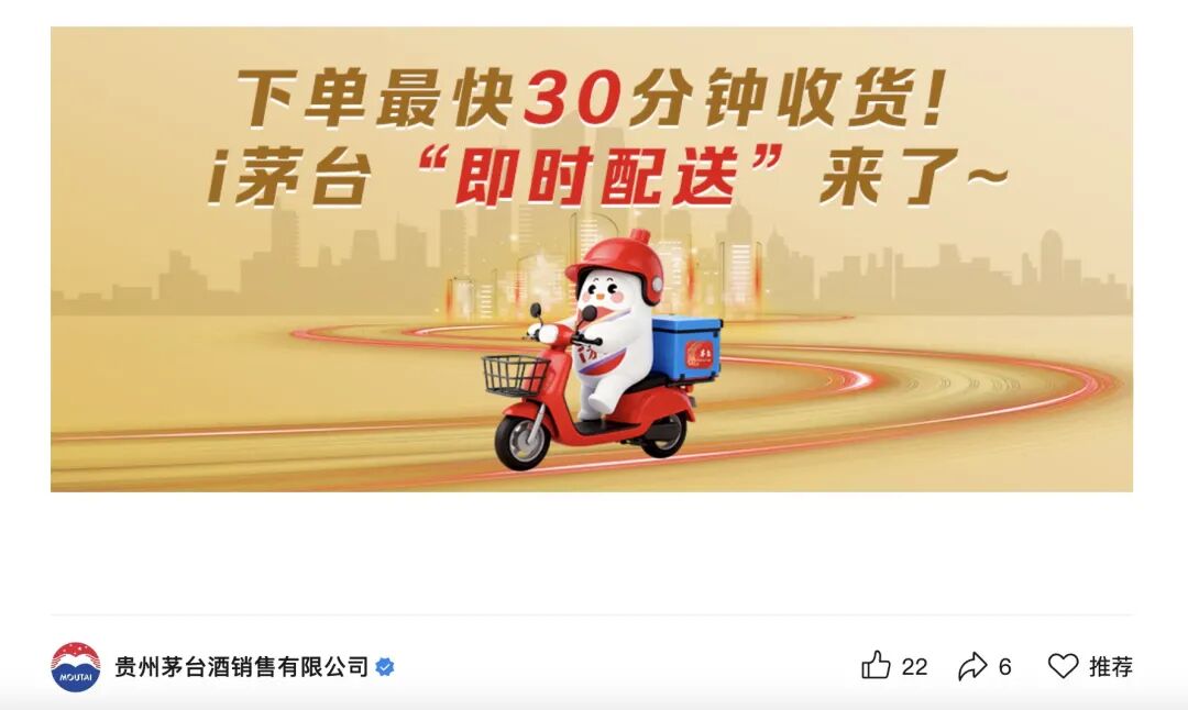 贵州茅台销售有限公司微信公众号发布消息称,9月30日09:00起,在原有“快递配送”与“门店自提”两种收货方式基础上,i茅台APP全新推出“即时配送”服务。依托平台上千家线下终端渠道体系,i茅台APP将实现“同城即时达”,下单“最快30分钟”收货。
