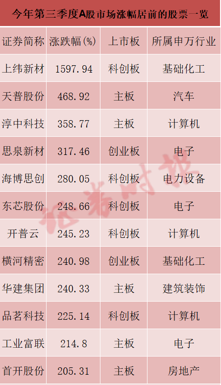 具体来看,今年第三季度逾千只股票涨幅超过30%,逾90只股票涨幅超过100%。其中,上纬新材、天普股份、淳中科技、思泉新材、海博思创、东芯股份、开普云、横河精密、华建集团、品茗科技、工业富联、首开股份等股票期间累计涨幅超过200%。