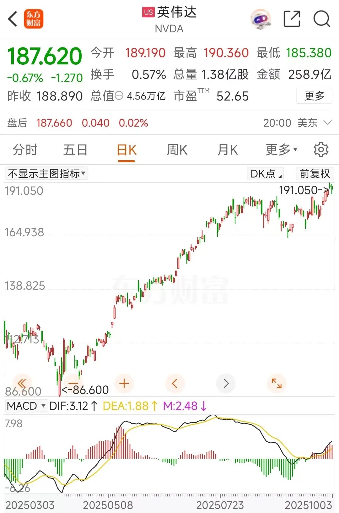 英伟达的股价也一路上扬,10月2日盘中还创出了191.05美元的历史新高。当前,英伟达股价为187.62美元,总市值为4.56万亿美元,较美股市值第二高的微软(3.85万亿美元)多出约7100亿美元。自4月7日刷出阶段新低开始,迄今英伟达已累计大涨98.98%。