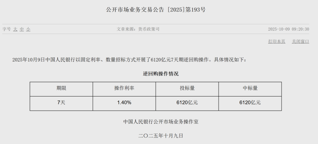 10月9日,中国人民银行以固定利率、数量招标方式开展6120亿元7天期逆回购操作。由于当日有20633亿元逆回购到期,实现净回笼14513亿元。