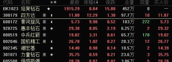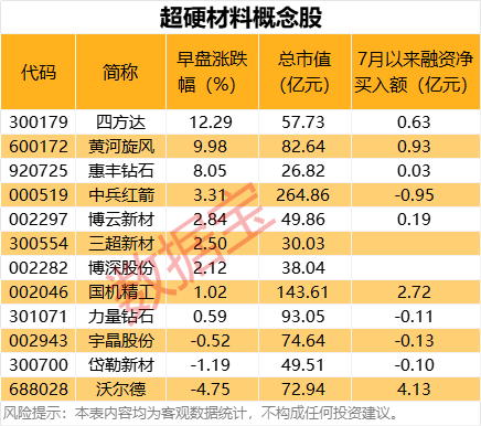 10月10日早盘,A股超硬材料概念领涨市场,概念股中四方达上涨12.29%,黄河旋风涨停,惠丰钻石、中兵红箭、博云新材、三超新材等上涨超2%。