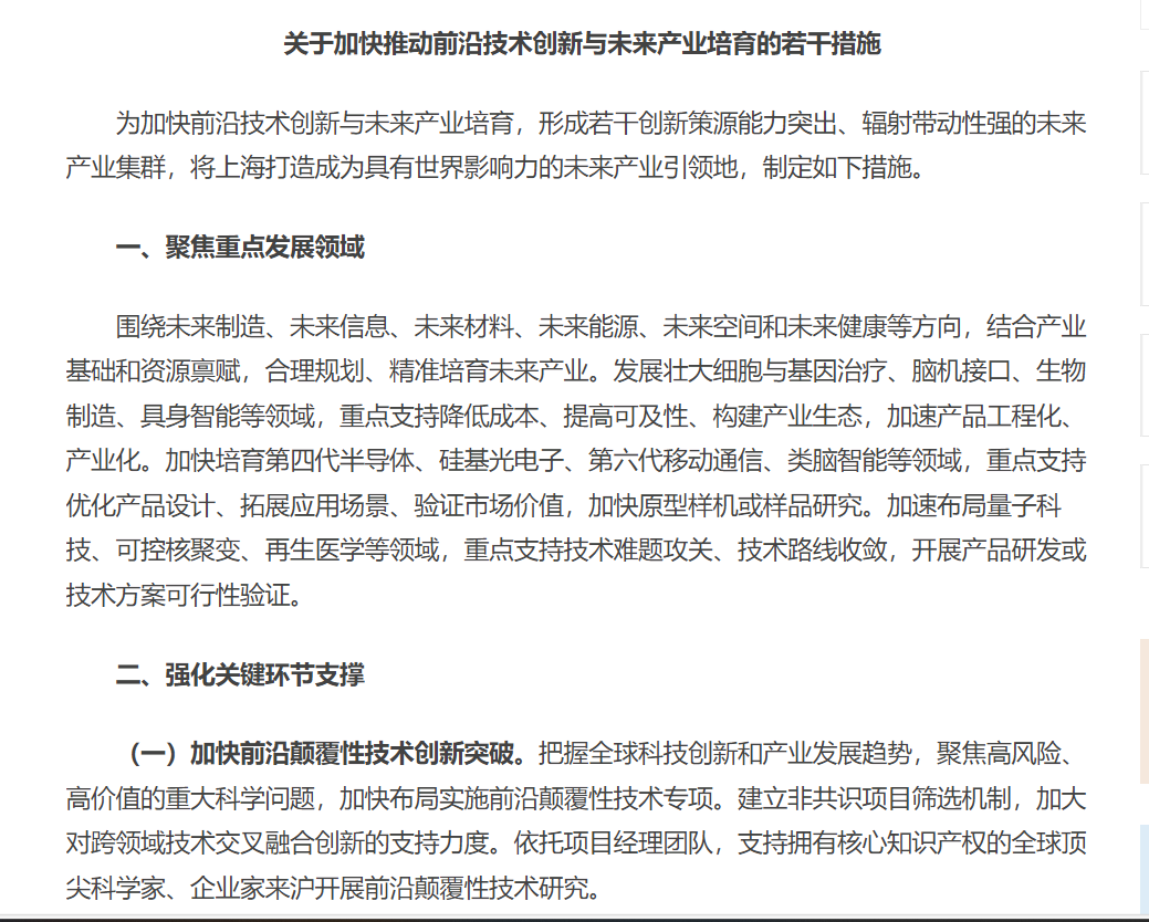根据当天发布的《若干措施》,上海将发展壮大细胞与基因治疗、脑机接口、生物制造、具身智能等领域;加快培育第四代半导体、硅基光电子、第六代移动通信(6G)、类脑智能等领域;加速布局量子科技、可控核聚变、再生医学等领域。