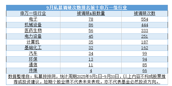 据私募排排网统计,9月电子成为私募调研频次最多的行业,该行业中78只个股接受私募调研,合计调研频次达554次。机械设备板块则以444次的调研频次紧随其后,被调研个股数量达86家。