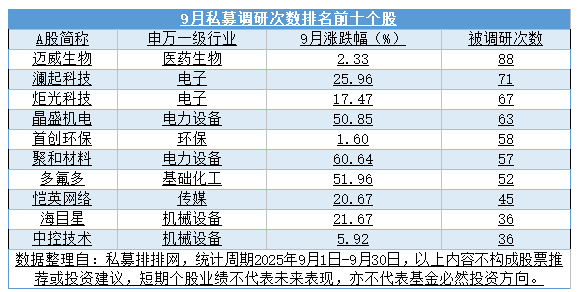 另外,9月医药生物、电力设备、计算机和基础化工同样受到私募关注,被调研频次均不少于100次,被调研个股数量均高于30只。