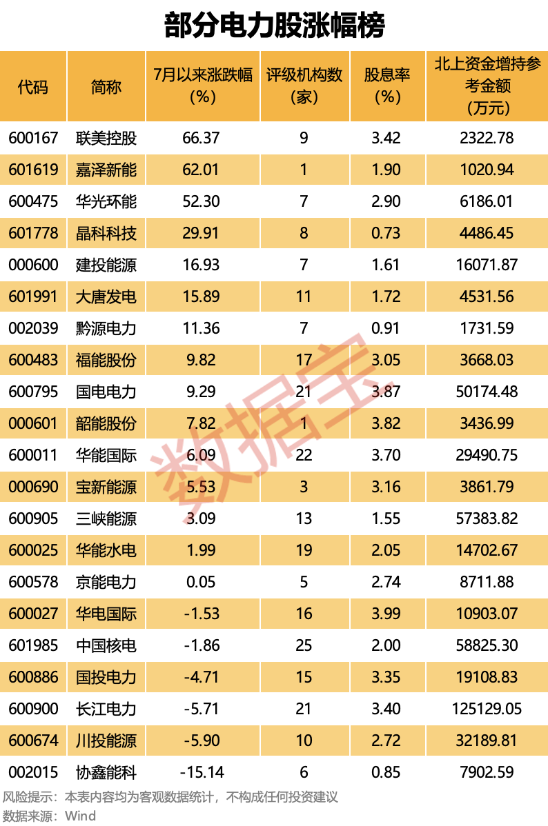 从股价表现来看,截至10月10日收盘,联美控股7月以来累计大涨超66%居首。还有嘉泽新能、华光环能、晶科科技等涨幅居前。