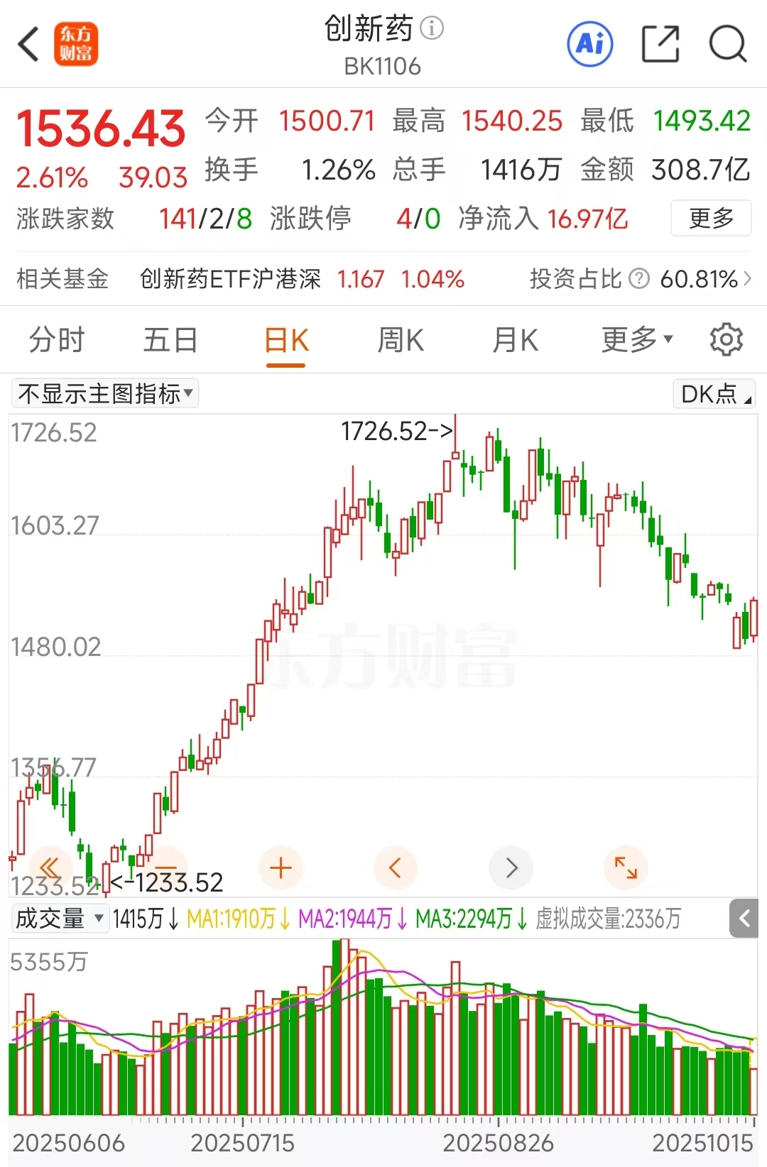 A股三大指数10月15日早盘迎来反弹,其中创新药方向表现强势,早盘收盘时指数上涨2.71%,居概念涨幅榜前列。