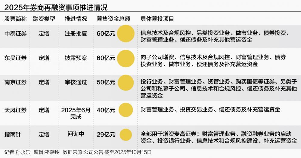 2025年以来,多家券商密集推进定增计划,形成明显的“补血”潮。其中,指南针(300803.SZ)5月更新29亿元定增方案修订稿;天风证券(601162.SH)6月23日完成40亿元定增募资;东吴证券(601555.SH)7月10日公布60亿元定增预案,成为年内首家公布定增计划的券商;南京证券(601990.SH)50亿元定增也于9月29日获上交所审核通过。