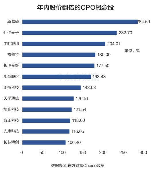 个股而言,新易盛暂居CPO概念年内“涨幅王”宝座,累计上涨284.69%。仕佳光子紧随其后,年内上涨232.7%。中际旭创居第三位,年内上涨204.01%。整个概念板块年内上涨中位数为38.33%。