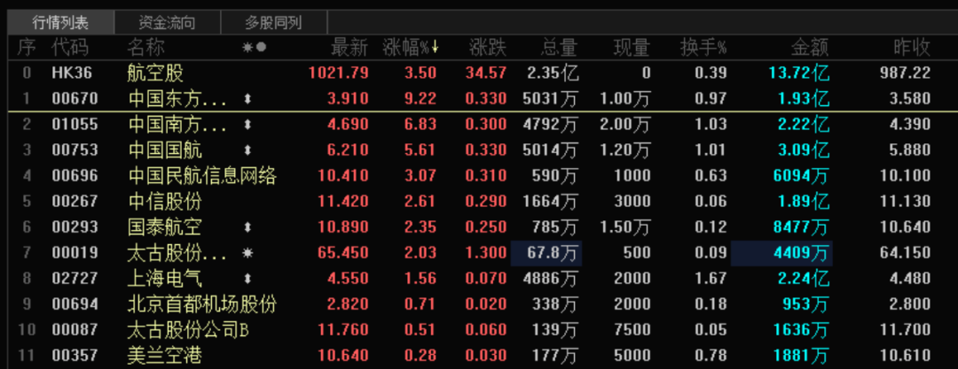今日午后,港股航空股持续走高,中国东方航空股份一度涨超10%,中国南方航空股份一度涨超7%,中国国航涨超5%,国泰航空跟涨。东方航空、南方航空、华夏航空等A股也是集体拉升。