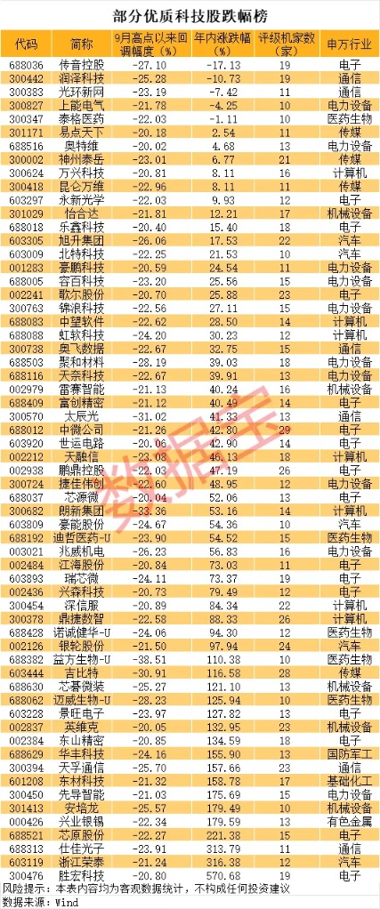 短线超跌优质科技股未来能否反弹?据证券时报·数据宝统计,10家及以上机构评级的科技题材股中,有60多只个股最新价较9月高点以来回调超20%。从题材分布来看,上榜个股主要集中在AI题材、新能源、医药、机器人等。比如AI板块的鹏鼎控股、鼎捷数智、英维克等;新能源的聚和材料、先导智能、容百科技等;医药行业的迪哲医药-U、泰格医药等;机器人题材的怡合达、雷赛智能、兆威机电等。