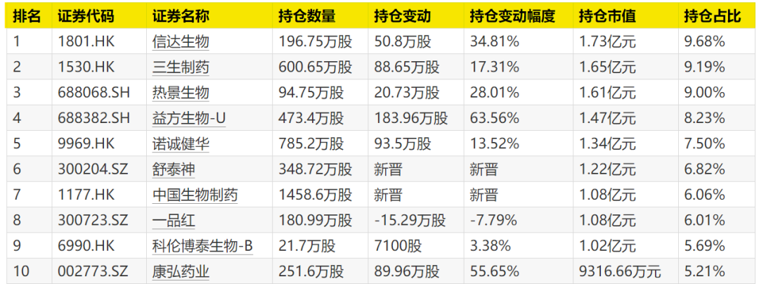 前三大重仓股为信达生物、三生制药、热景生物;舒泰神、中国生物制药“新晋”十大重仓股,持仓市值均超1亿元。