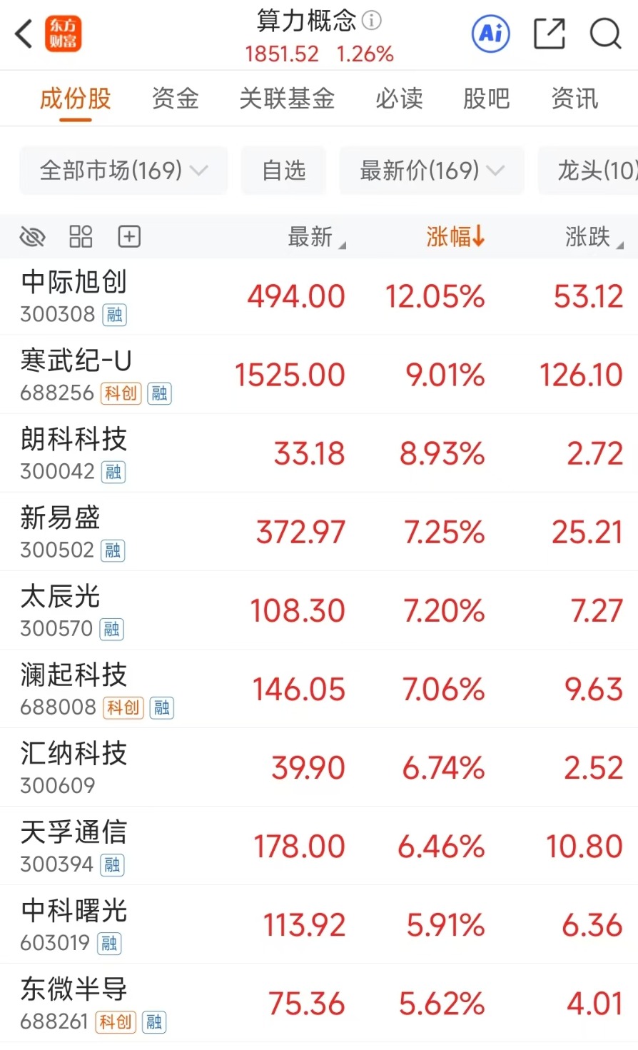算力龙头们10月24日再次集体走强,“易中天”“纪联海”纷纷涨幅靠前,其中中际旭创大涨12.05%并创出历史新高,寒武纪涨9.01%且股价再次超过贵州茅台。新易盛、澜起科技、天孚通信、中科曙光、海光信息、工业富联这些千亿甚至万亿巨头,也均涨幅超过5%。