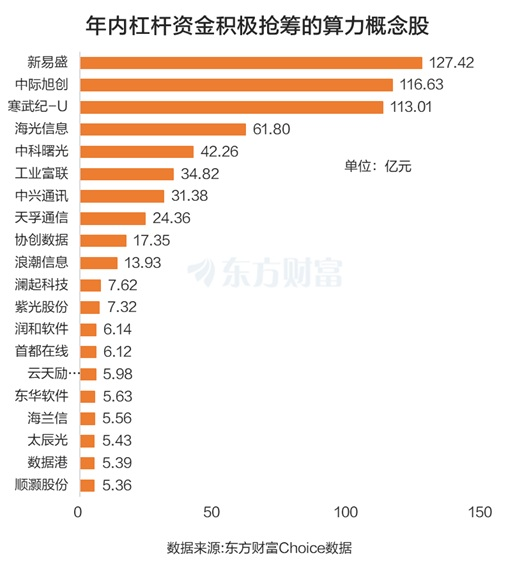 而从杠杆资金角度来看,新易盛也是年内杠杆资金抢筹最多的,被融资净买入127.42亿元。中际旭创紧随其后,被融资净买入116.63亿元。寒武纪也被杠杆资金融资净买入过百亿,金额为113.01亿元。