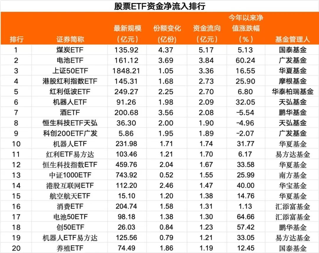 从资金净买入排行榜看,当日净流入1亿元以上的股票ETF有24只,部分宽基ETF和行业主题ETF净流入居前。其中,煤炭ETF、电池ETF、上证50ETF位居前三,资金净流入均超3亿元。