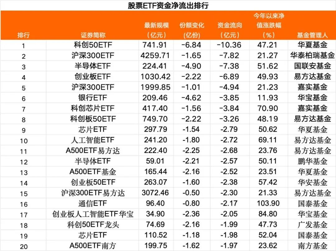 在净流出前20大股票ETF中,宽基方面,3只科创板50ETF合计净流出资金接近16亿元;3只沪深300ETF合计净流出超15亿元;2只创业板ETF合计净流出资金超9亿元;3只中证A500ETF净流出资金也超过了7亿元。