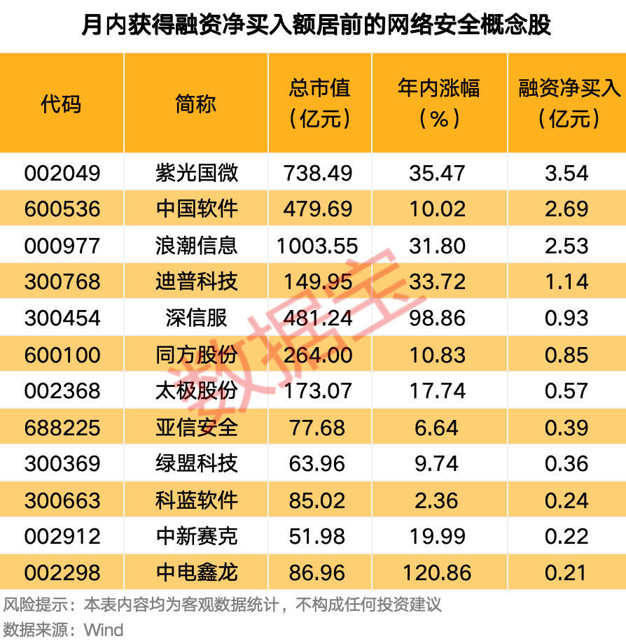 从资金面来看,截至10月28日,19只概念股月内获得融资净买入,紫光国微、中国软件、浪潮信息、迪普科技的融资净买入额居前,均超亿元。