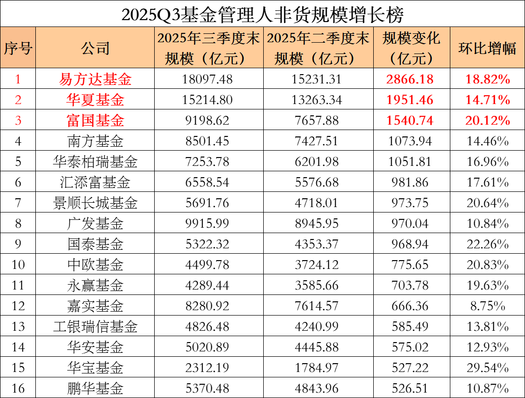 其中,易方达基金三季度非货规模激增2866亿元,增幅近19%,位居非货规模增长榜首;华夏基金增长1951亿元,位居第二;富国基金增长1541亿元,名列第三。南方基金和华泰柏瑞基金也增长1000亿元以上,分别增长1074亿元、1052亿元。