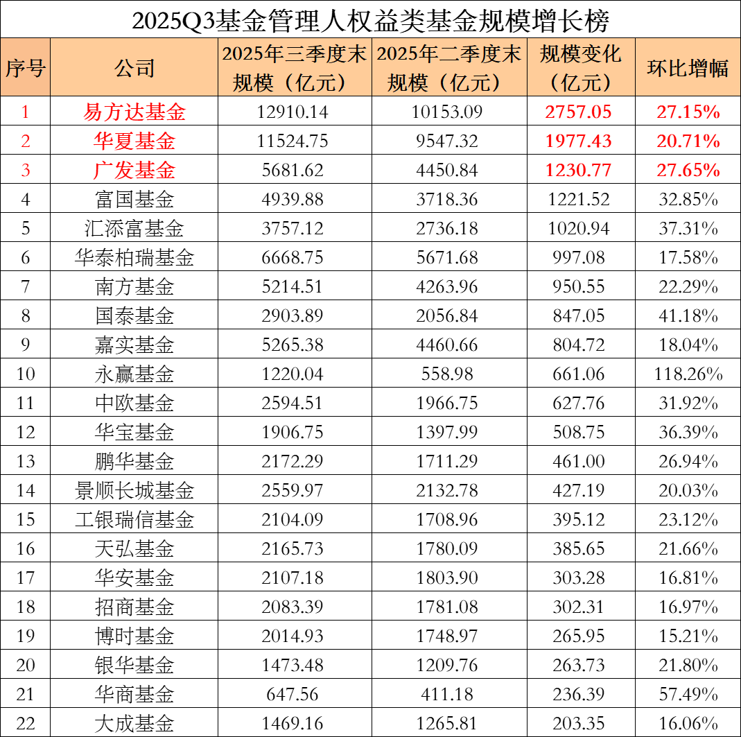 权益资产再度成为市场的焦点,这既为擅长主动权益投资的机构,也为股票ETF领域占据头部地位的公募基金提供了规模增长的重要机遇,同时基金公司管理规模也出现相应调整。其中,权益投资规模占比高、核心竞争力突出的基金公司,在三季度实现了更为显著的规模增长。
