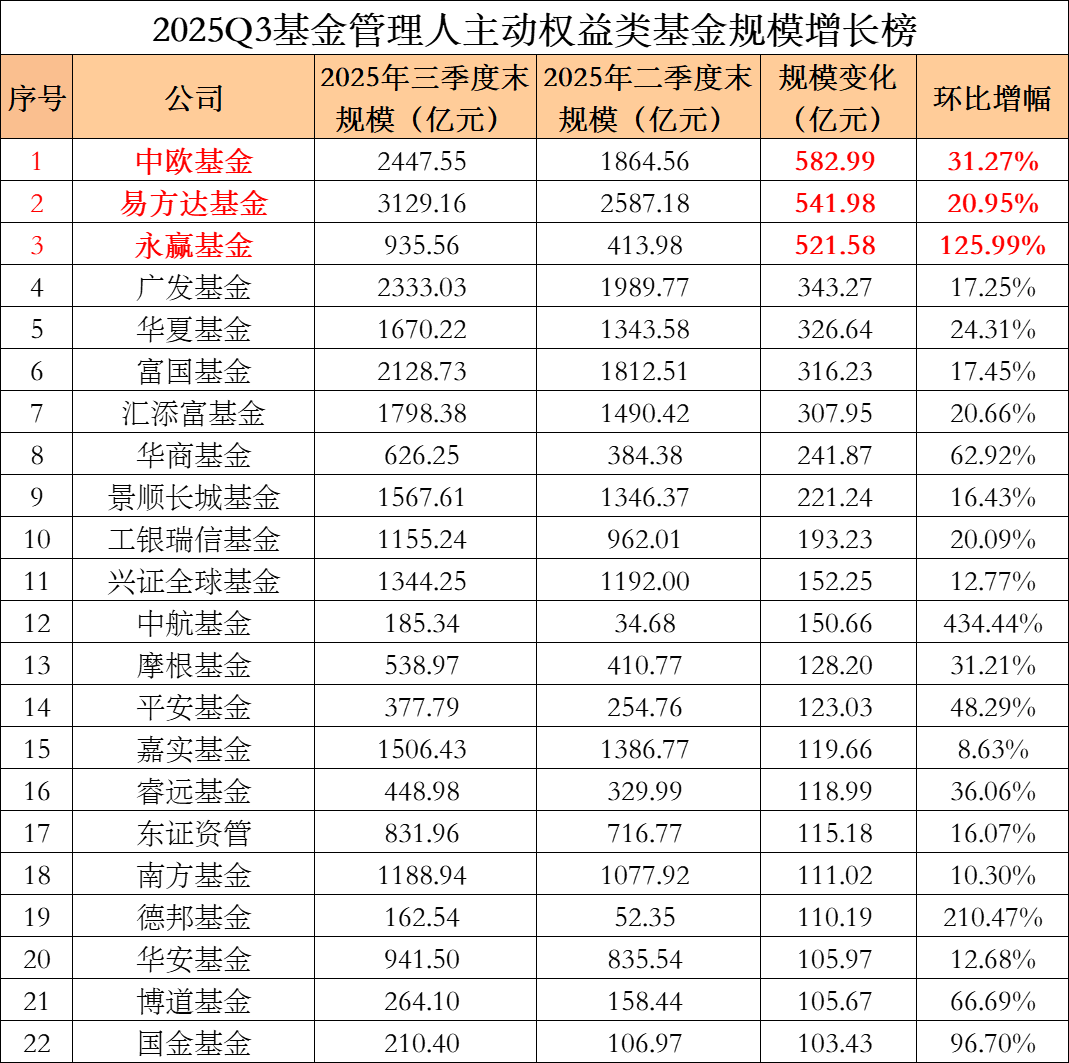 业内人士认为,主动权益基金依然是不少基金公司实现规模增长的重要抓手。三季度市场赚钱效应释放,叠加优质基金经理的专业投研能力与长期业绩背书,不仅推动头部公司规模持续领跑,也让部分发力主动权益的中小公司实现跨越式增长。