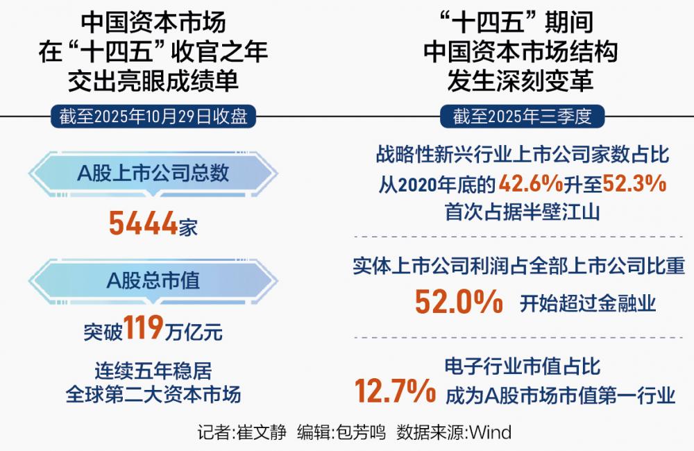 中国资本市场在“十四五”收官之年交出亮眼成绩单:截至2025年10月29日收盘,A股上市公司总数达5444家,总市值突破119万亿元,“十四五”期间连续五年稳居全球第二大资本市场。