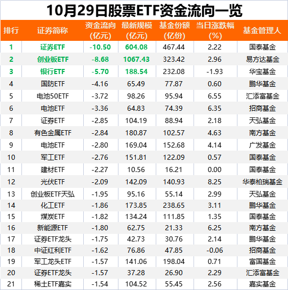 市场突破关键点位,股票ETF遭遇资金净赎回。Wind数据显示,上一交易日(10月29日)股票ETF市场总份额减少22.02亿份,按照成交均价测算,当日净流出资金约7.88亿元。