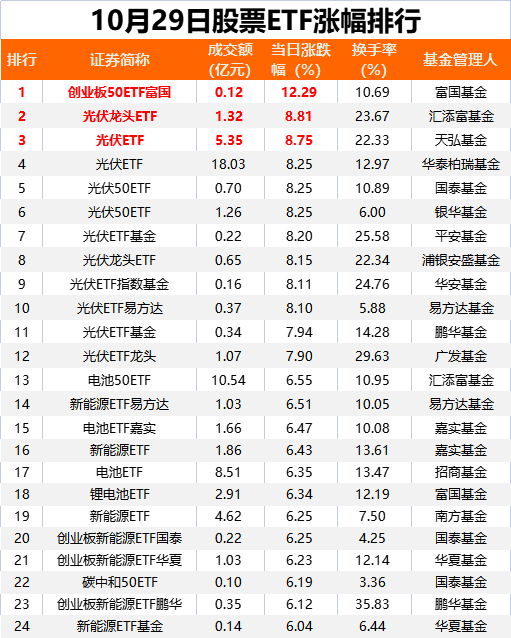 从股票ETF二级市场表现看,创业板50ETF富国以12.29%的涨幅领跑。同时,伴随着光伏板块大涨,相关ETF纷纷上涨,光伏龙头ETF大涨8.81%,天弘光伏ETF大涨8.75%,华泰柏瑞光伏ETF、国泰光伏50ETF和银华光伏50ETF均大涨8.25%。