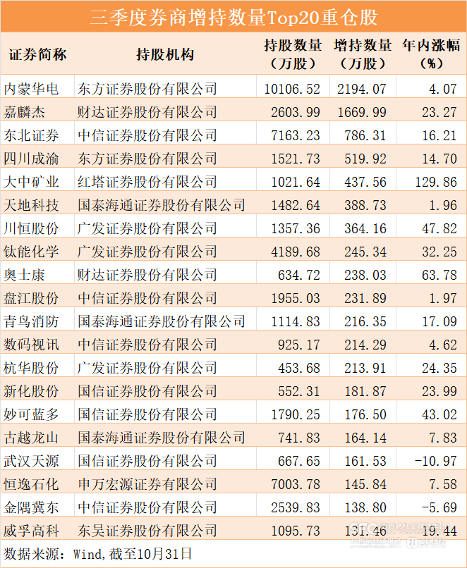 从个股增持力度来看,内蒙华电获东方证券大幅增持2194.07万股,被持股数量突破1亿股,位列单家券商增持数量榜首。自2024年新进持有该股以来,东方证券连续5个季度持续增持内蒙华电,目前已成为后者第五大股东。
