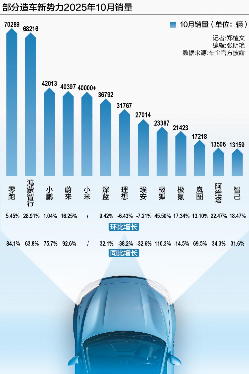 零跑汽车再度以70289辆的月交付量稳居榜首,并且创下历史新高,首次突破了7万辆大关;鸿蒙智行紧随其后,月交付量超6万辆;小鹏、小米连续两个月站稳4万辆台阶;蔚来也首次跻身“四万辆俱乐部”;极狐、岚图等二线品牌增长显著,同比增幅分别达110.3%和69.5%。