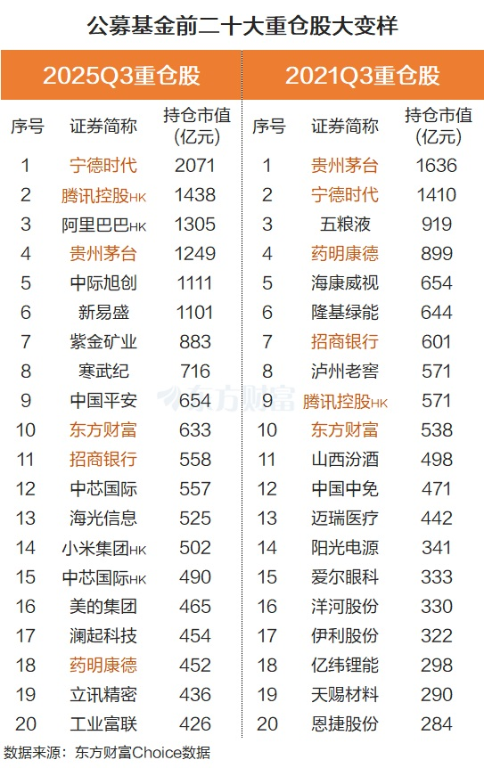 下图是公募基金2025Q3前二十大持仓与2021Q3前二十大持仓的比较。可见2025Q3的前二十大持仓已是“科技感”满满,比如中际旭创、新易盛、中芯国际、海光信息、立讯精密、澜起科技、工业富联等多家热门科技股均位列其中。而2021年消费股抱团行情火热时,贵州茅台、五粮液、泸州老窖、山西汾酒、中国中免、洋河股份、伊利股份等纷纷位列前二十大重仓股,可现在除了贵州茅台外,其余均已“不见踪影”。