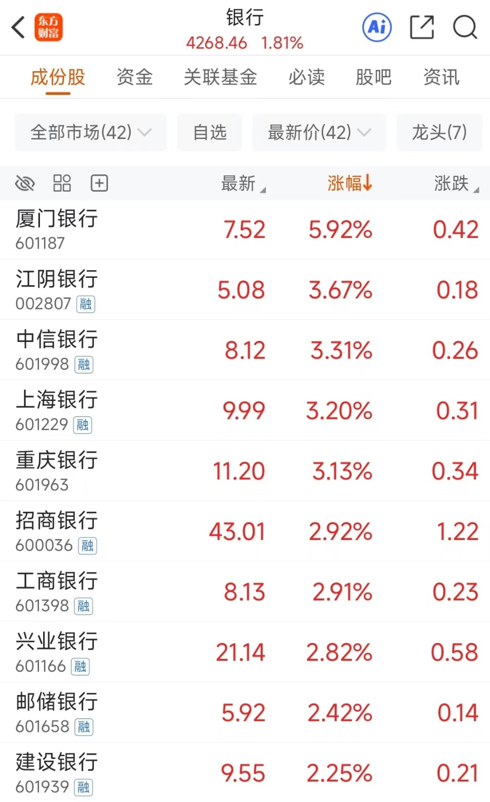 股息率(TTM)而言,42家银行股的股息率中位数达4.14%,其中11家超过5%,兴业银行的股息率最高,为7.69%。