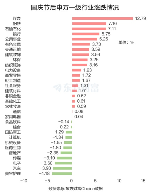 而年初至国庆节前,申万一级涨幅前五的行业分别是有色金属、通信、电子、电力设备和综合。