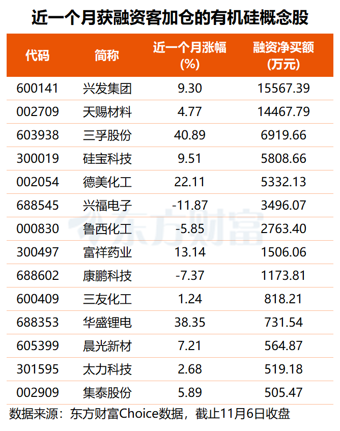 有机硅概念股早盘集体走强,东岳硅材、瑞泰新材20cm涨停,合盛硅业、江苏国泰封涨停板,华盛锂电、富祥药业涨超10%,天赐材料、新安股份、硅宝科技等多股跟涨。