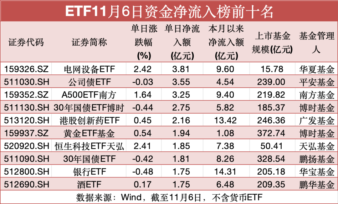 从具体资金流向上看,11月6日,跟踪电网设备、中证A500、港股创新药相关指数的ETF资金净流入居前,跟踪科创板、创业板以及芯片类指数的相关ETF遭遇净赎回。