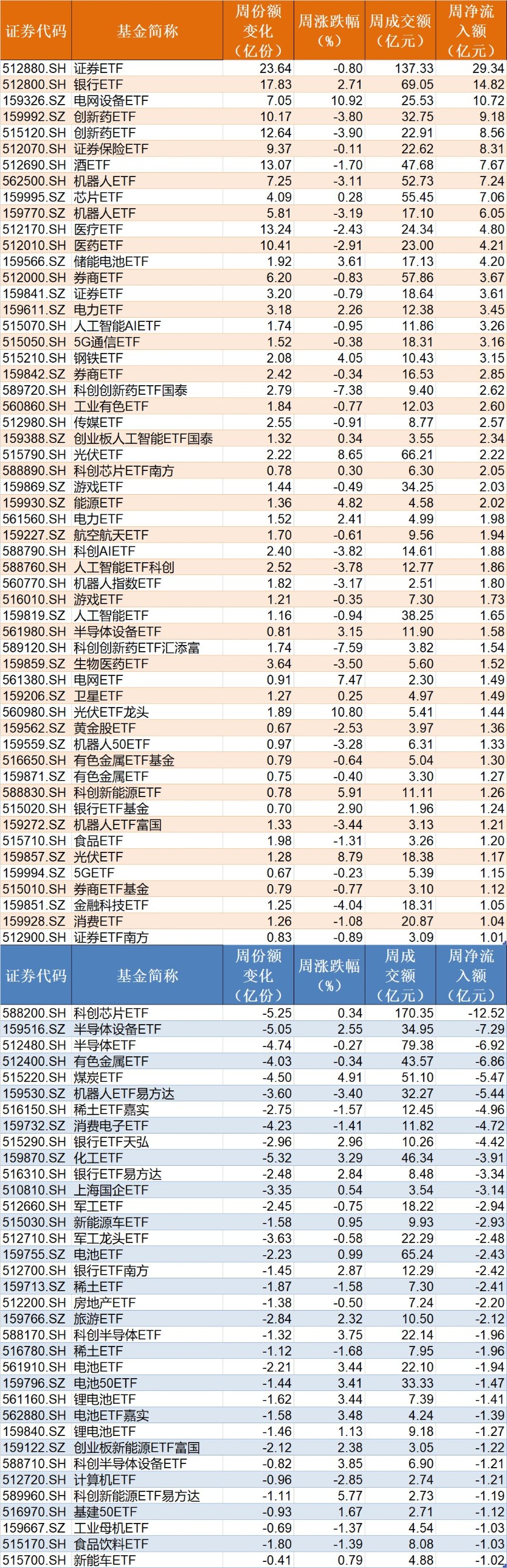 行业主题上看,券商、电网设备等ETF被资金看好,而半导体相关ETF被资金抛售。