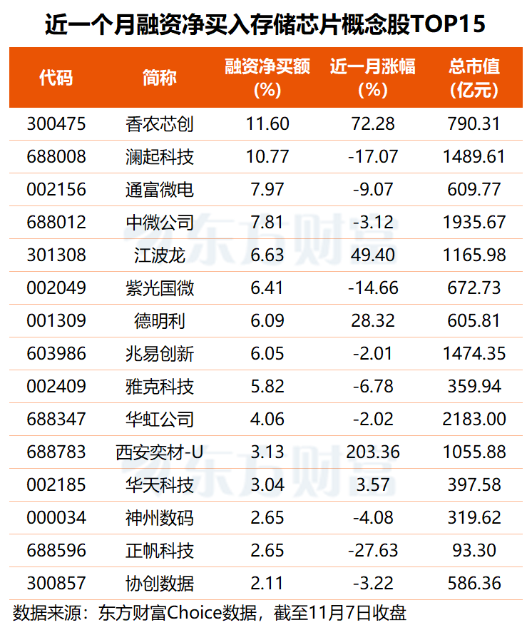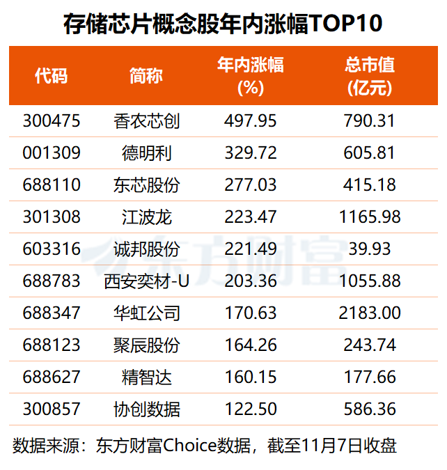 受益于AI主线行情,今年以来,存储芯片概念走势较好,板块指数累计上涨约64%,远超同期创业板指和科创50指数。板块内超九成概念股年内实现上涨,28股跑赢板块指数,14股股价翻倍。其中,香农芯创股价大涨近500%,德明利涨超3倍,东芯股份、江波龙、诚邦股份累计涨幅均在200%以上。