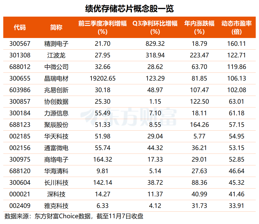 从业绩层面看,三季报显示,共有41只存储芯片概念股前三季度归母净利润实现同比增长,其中,晶瑞电材以19202.65%的增幅大幅领跑,深科达、概伦电子等6股净利同比增逾一倍。